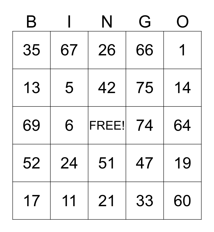 This bingo card has a free space and 24 words: 24, 11, 42, 17, 1, 35, 13, 67, 74, 51, 75, 69, 47, 19, 5, 33, 64, 26, 14, 6, 60, 52, 66 and 21.