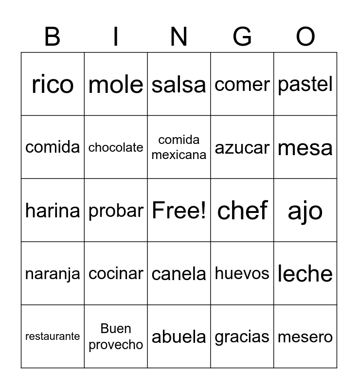 This bingo card has a free space and 25 words: cocinar, abuela, comida mexicana, restaurante, pastel, rico, comida, mole, chef, canela, azucar, harina, huevos, leche, chocolate, chile, ajo, salsa, mesa, probar, mesero, Buen provecho, naranja, comer and gracias.