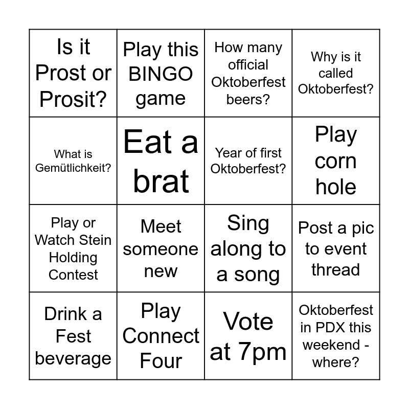This bingo card has 16 words: Play Connect Four, Post a pic to event thread, How many official Oktoberfest beers?, Is it Prost or Prosit?, Play or Watch Stein Holding Contest, Play this BINGO game, Sing along to a song, Vote at 7pm, What is Gemütlichkeit?, Eat a brat, Drink a Fest beverage, Why is it called Oktoberfest?, Meet someone new, Play corn hole, Year of first Oktoberfest? and Oktoberfest in PDX this weekend - where?.