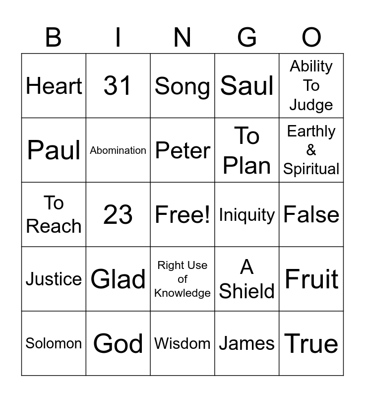 This bingo card has a free space and 29 words: Solomon, David, 23, Fear, Heart, Song, Abomination, Glad, Iniquity, God, False, True, Wisdom, James, Earthly & Spiritual, 31, Right Use of Knowledge, Justice, Ability To Judge, To Reach, A Shield, Extreme Hatred, To Plan, Paul, Saul, 31, Fruit, Peter and 27.
