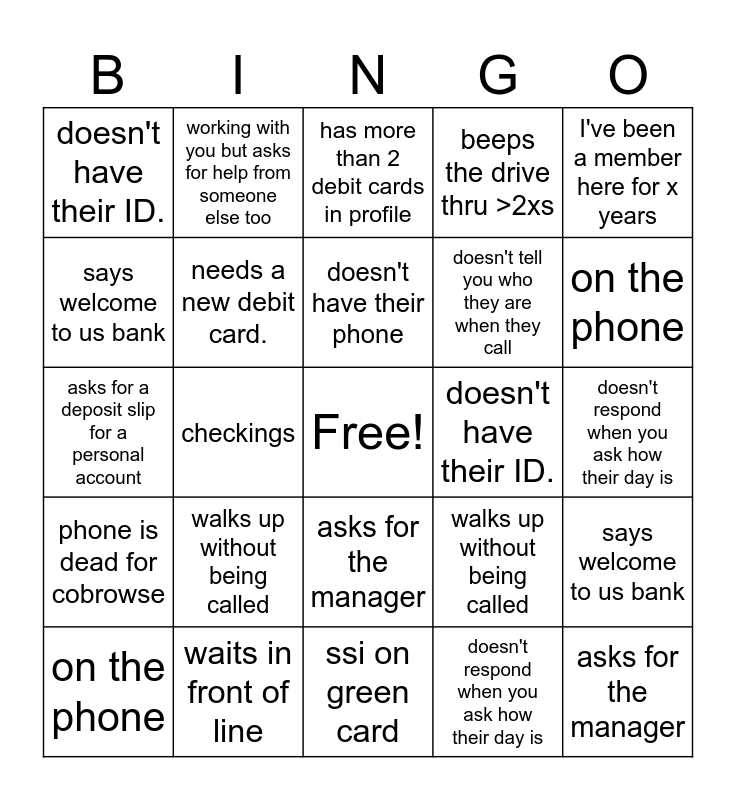 This bingo card has a free space and 24 words: walks up without being called, waits in front of line, doesn't have their phone, on the phone, I've been a member here for x years, doesn't have their ID., says welcome to us bank, working with you but asks for help from someone else too, doesn't have their ID., asks for the manager, doesn't tell you who they are when they call, asks for a deposit slip for a personal account, walks up without being called, says welcome to us bank, needs a new debit card., doesn't respond when you ask how their day is, doesn't respond when you ask how their day is, has more than 2 debit cards in profile, on the phone, checkings, asks for the manager, phone is dead for cobrowse, beeps the drive thru >2xs and ssi on green card.