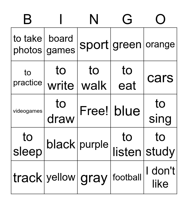 This bingo card has a free space and 43 words: I like, I don't like, cheer- leading, track, swimming, football, sport, red, orange, yellow, green, blue, purple, black, white, gray, movies, videogames, parties, cars, board games, to swim, to dance, to take photos, to cook, to sing, to read, to rest, to listen, to sleep, to speak, to study, to go shopping, to draw, to watch, to ride a bike, to skateboard, to walk, to practice, to eat, to run, to write and to go out with friends.