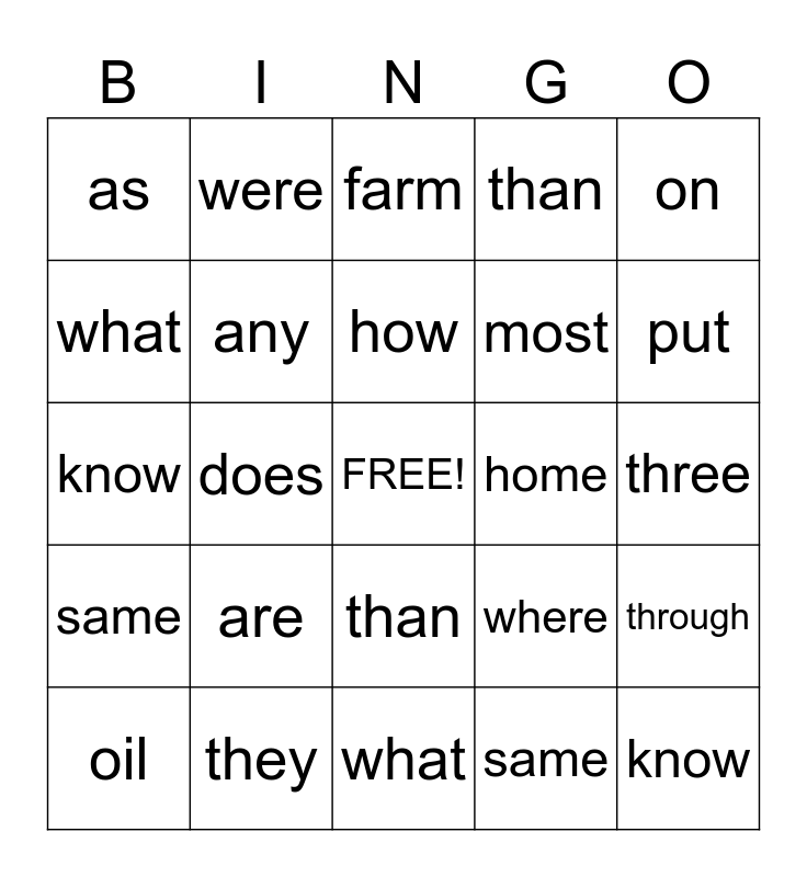 This bingo card has a free space and 24 words: are, they, how, oil, on, as, what, were, home, than, most, know, where, through, any, same, three, farm, put, does, know, same, than and what.