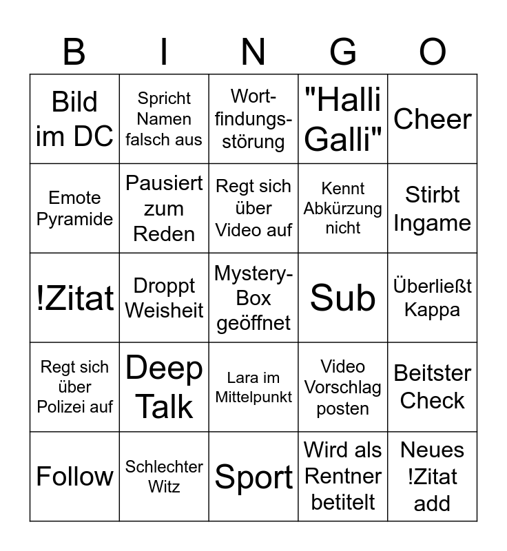 This bingo card has 25 words: Deep Talk, Sport, Regt sich über Video auf, Follow, Cheer, Bild im DC, Emote Pyramide, Spricht Namen falsch aus, Sub, Lara im Mittelpunkt, Kennt Abkürzung nicht, !Zitat, Video Vorschlag posten, Beitster Check, Pausiert zum Reden, Neues !Zitat add, Überließt Kappa, Wort- findungs- störung, Stirbt Ingame, Droppt Weisheit, Mystery-Box geöffnet, Schlechter Witz, Regt sich über Polizei auf, "Halli Galli" and Wird als Rentner betitelt.