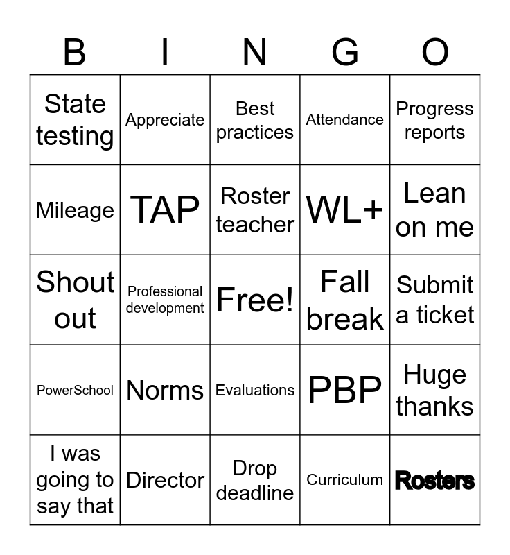 This bingo card has a free space and 24 words: I was going to say that, Norms, Roster teacher, Curriculum, Progress reports, State testing, Appreciate, Best practices, Fall break, Submit a ticket, Shout out, TAP, PBP, Huge thanks, Mileage, Director, Drop deadline, Attendance, Lean on me, PowerSchool, Professional development, Evaluations, WL+ and Rosters.