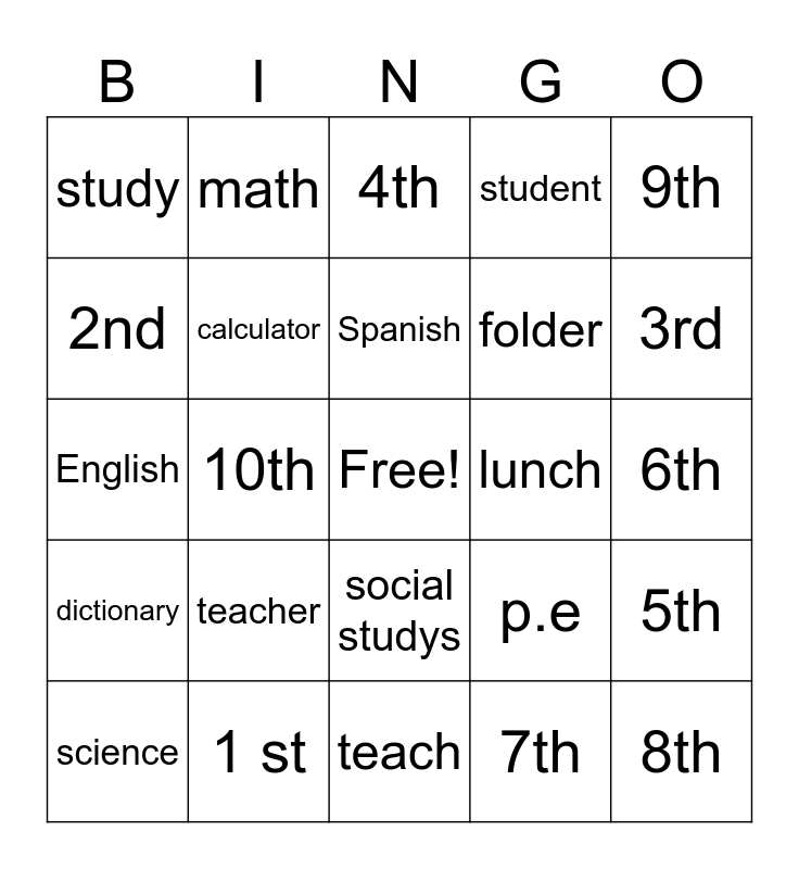 This bingo card has a free space and 24 words: teacher, 1 st, Spanish, science, 9th, study, 2nd, math, lunch, social studys, folder, English, p.e, 5th, calculator, 7th, 6th, 4th, 3rd, 10th, 8th, dictionary, student and teach.