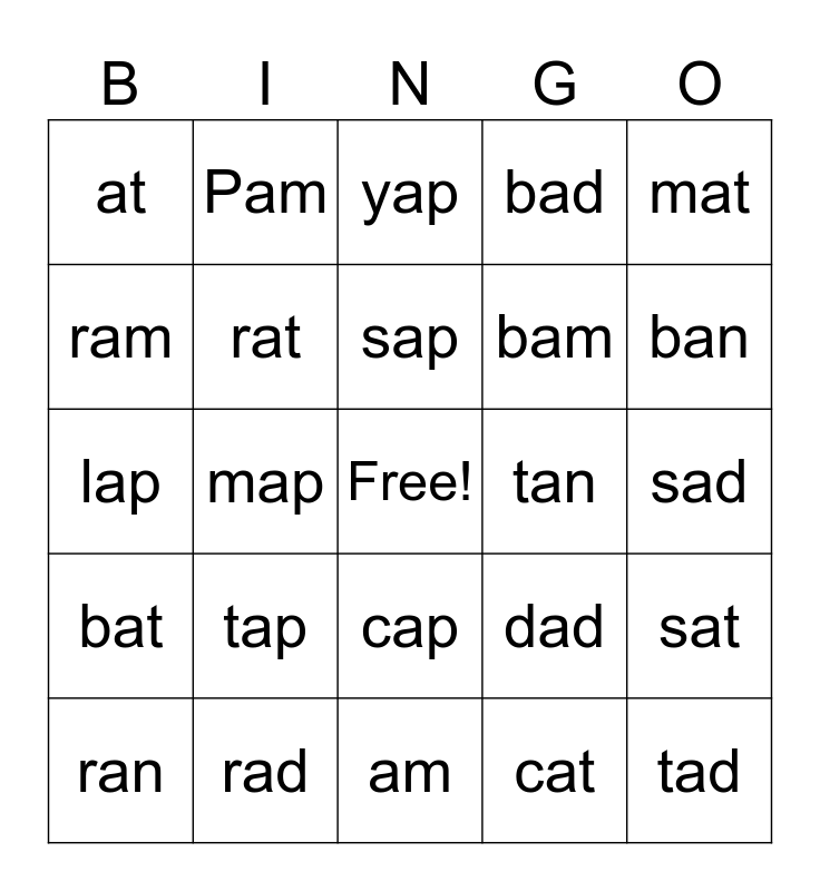 This bingo card has a free space and 32 words: cat, nap, map, jam, bat, rat, mat, sat, Pam, Sam, sap, yap, rap, fan, tan, van, ran, lap, cap, tap, dad, mad, sad, rad, tad, bad, bam, ram, at, am, can and ban.