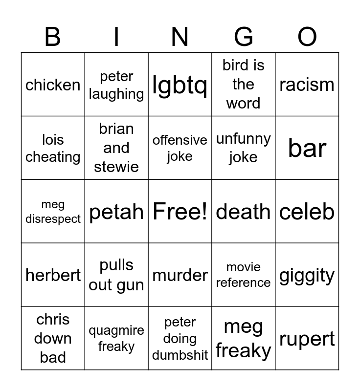 This bingo card has a free space and 24 words: pulls out gun, quagmire freaky, offensive joke, chris down bad, racism, chicken, lois cheating, peter laughing, death, murder, unfunny joke, meg disrespect, movie reference, giggity, brian and stewie, meg freaky, celeb, lgbtq, bar, petah, rupert, herbert, bird is the word and peter doing dumbshit.