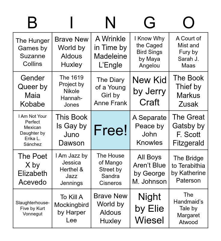 This bingo card has a free space and 35 words: Hidden Figures: The True Story of Four Black Women and the Space Race, Sold by Patricia McCormick, The Perks of Being a Wallflower by Stephen Chbosky, The 1619 Project by Nikole Hannah-Jones, The House of Mango Street by Sandra Cisneros, I Know Why the Caged Bird Sings by Maya Angelou, Gender Queer by Maia Kobabe, The Absolutely True Diary of a Part-Time Indian by Sherman Alexie, The Diary of a Young Girl by Anne Frank, The Hate U Give by Angie Thomas, I Am Not Your Perfect Mexican Daughter by Erika L. Sánchez, A Court of Mist and Fury by Sarah J. Maas, Let’s Talk About It by Erika Moen and Matthew Nolan, The Hobbit by J.R.R. Tolkien, The Hunger Games by Suzanne Collins, A Separate Peace by John Knowles, Night by Elie Wiesel, This Book Is Gay by Juno Dawson, The Poet X by Elizabeth Acevedo, The Handmaid’s Tale by Margaret Atwood, All Boys Aren’t Blue by George M. Johnson, Slaughterhouse-Five by Kurt Vonnegut, The Bridge to Terabithia by Katherine Paterson, To Kill A Mockingbird by Harper Lee, A Wrinkle in Time by Madeleine L’Engle, The Book Thief by Markus Zusak, Fahrenheit 451 by Ray Bradbury, Flamer by Mike Curato, New Kid by Jerry Craft, The Great Gatsby by F. Scott Fitzgerald, The Catcher in the Rye by J.D. Salinger, Brave New World by Aldous Huxley, I Am Jazz by Jessica Herthel & Jazz Jennings, Brave New World by Aldous Huxley and 1984 by George Orwell.