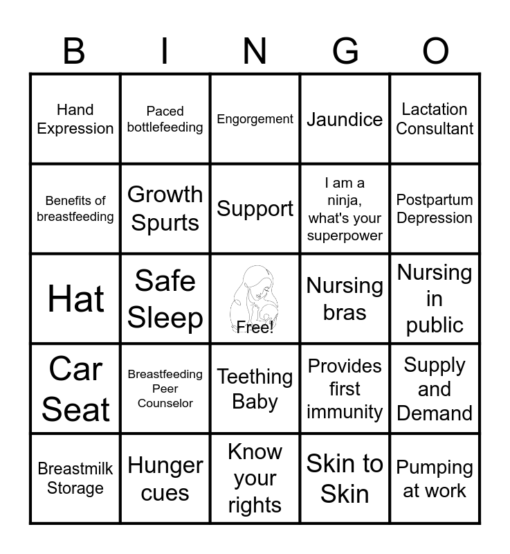 This bingo card has a free space and 24 words: Breastfeeding Peer Counselor, Hunger cues, Support, Breastmilk Storage, Lactation Consultant, Hand Expression, Benefits of breastfeeding, Paced bottlefeeding, Nursing bras, Teething Baby, I am a ninja, what's your superpower, Hat, Provides first immunity, Supply and Demand, Growth Spurts, Skin to Skin, Nursing in public, Engorgement, Postpartum Depression, Safe Sleep, Pumping at work, Car Seat, Jaundice and Know your rights.