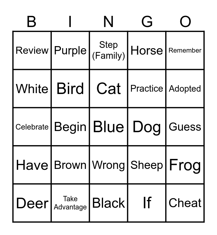 This bingo card has 50 words: Red, Blue, Green, Black, Brown, Yellow, Purple, Orange, White, Gold, Bird, Horse, Frog, Sheep, Bear, Duck, Cat, Dog, Fish, Remember, Begin, If, Review, Practice, Question, Cheat, Adopted, Half, Step (Family), Wrong, Right, Opps, Finger- spell, Wait, Take Advantage, No Idea, Match, Expressions, Bored, Guess, Nice, Meet you, Next Week, Ready, Deer, Celebrate, Love, Don't Want, Have and When.
