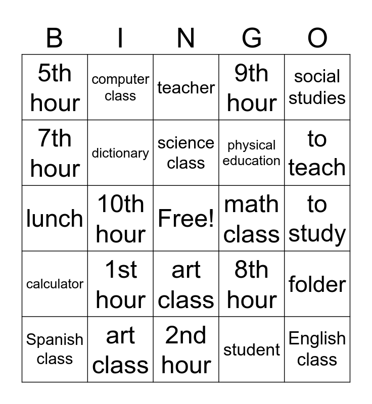 This bingo card has a free space and 24 words: 1st hour, art class, science class, Spanish class, social studies, 5th hour, 7th hour, computer class, math class, art class, physical education, lunch, 8th hour, folder, dictionary, student, to study, teacher, to teach, 10th hour, English class, calculator, 9th hour and 2nd hour.