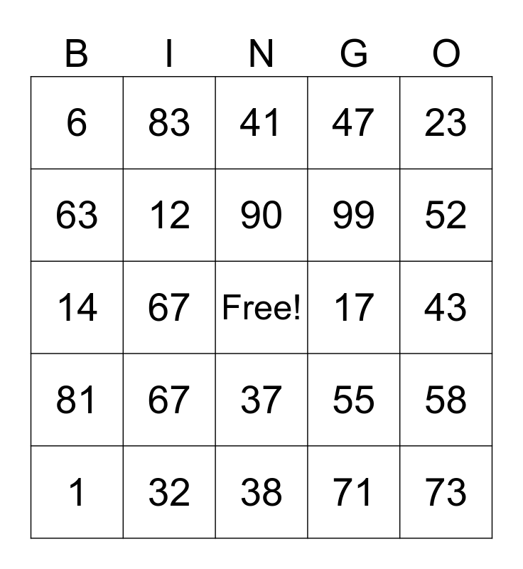 This bingo card has a free space and 24 words: 67, 32, 90, 1, 23, 6, 63, 83, 17, 37, 99, 14, 55, 58, 12, 71, 43, 41, 52, 67, 73, 81, 47 and 38.