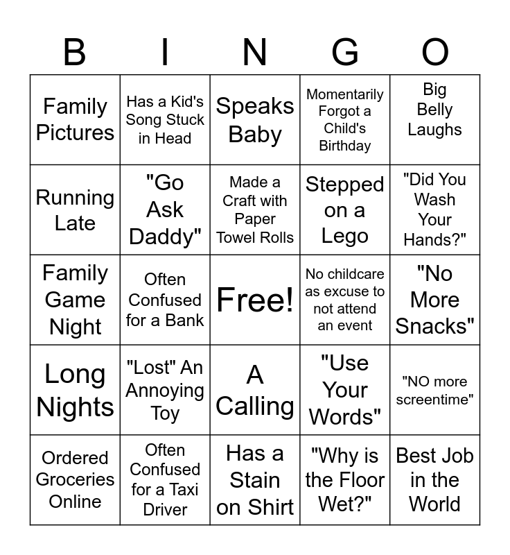 This bingo card has a free space and 24 words: "Lost" An Annoying Toy, Often Confused for a Taxi Driver, Made a Craft with Paper Towel Rolls, Ordered Groceries Online, Big Belly Laughs, Family Pictures, Running Late, Has a Kid's Song Stuck in Head, No childcare as excuse to not attend an event, A Calling, Stepped on a Lego, Family Game Night, "Use Your Words", "NO more screentime", "Go Ask Daddy", "Why is the Floor Wet?", "No More Snacks", Speaks Baby, "Did You Wash Your Hands?", Often Confused for a Bank, Best Job in the World, Long Nights, Momentarily Forgot a Child's Birthday and Has a Stain on Shirt.