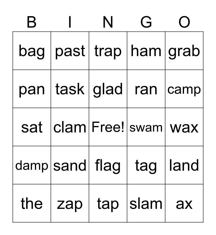 This bingo card has a free space and 29 words: the, bad, clam, band, bag, trap, task, sand, swam, zap, wax, ax, tap, slam, camp, cap, flag, damp, grab, sat, tag, mad, ran, pan, ham, past, land, glad and said.
