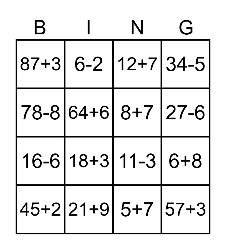 This bingo card has 16 words: 21+9, 6+8, 12+7, 87+3, 16-6, 6-2, 11-3, 5+7, 78-8, 64+6, 45+2, 34-5, 18+3, 27-6, 8+7 and 57+3.