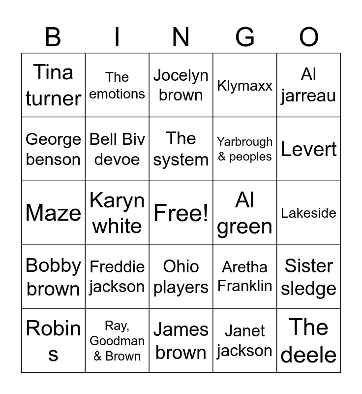 This bingo card has a free space and 125 words: Earth, Wind & Fire, Surface, Kashif, Guy, Anita baker, The Gap Band, Bobby brown, Shalamar, Janet jackson, Micheal jackson, Diana ross, Jeffrey Osborne, Keni Burke, Pebbles, Quincy jones, Whitney Houston, Ray, Goodman & Brown, The pointers Sisters, Teddy pendergrass, Debarge, Alexander O’Neal, Maze, Atlantic starr, Club Nouveau, Kool & The Gang, The system, Klymaxx, Denice Williams, Rick james, Loose ends, Sister sledge, The whispers, Karyn white, Freddie jackson, Cameo, Mercedes boy, René & Angela, Grover Washington jr, Eugene wilde, Luther vandross, Tina turner, Sheila E., Evelyn “Champagne” King, Regina belle, Cherrelle, McFadden & Whitehead, The Isley Brothers, Al jarreau, Lisa Lisa & cult jam, Sade, The manhattans, Mtume, Skyy, Slave, Glenn jones, George Benson, Al B. sure!, Chic, Smokey Robinson, Al green, George benson, Bobby womack, Cheryl lynn, Teena Marie, The S.O.S Band, Roger Zapp, Prince, Ohio players, George Clinton, Lakeside, Mass production, Keith sweat, Duice, The staple singers, O’Jays, The chi-Lites, Betty wright, Shirley brown, Tyrone davis, Marvin sease, Mary j blige, Crystal waters, Soul ll soul, Robin s, Bell Biv devoe, The commodores, Chaka khan, Debra laws, Frankie Beverly and maze, Phyllis Hyman, Ready for the world, Mc hammer, Marvin gaye, Johnny gill, Jocelyn brown, James brown, Isley brothers, Patti labelle, Gwen mccrae, The deele, Chuck brown, Aretha Franklin, One way, Parliament, Dazz band, Vanity 6, Donna summer, Levert, New edition, Dennis Edwards, Dynasty, George benson, Lisa, Evelyn champagne, Madonna, Midnight star, Patrice rushen, Carl carlton, The temptations, Yarbrough & peoples, Gwen guthrie, Baby face, Mary Jane girls, The emotions and Phyllis hyman.