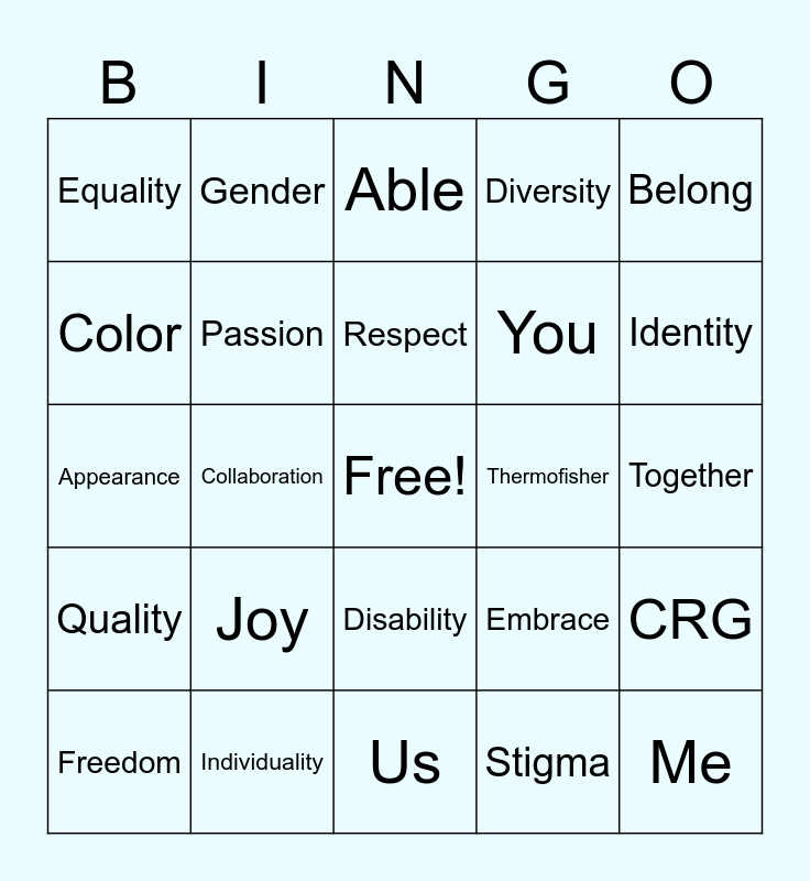 This bingo card has a free space and 24 words: Joy, Individuality, Respect, Freedom, Belong, Equality, Color, Gender, Thermofisher, Disability, You, Appearance, Embrace, CRG, Passion, Stigma, Together, Able, Identity, Collaboration, Me, Quality, Diversity and Us.