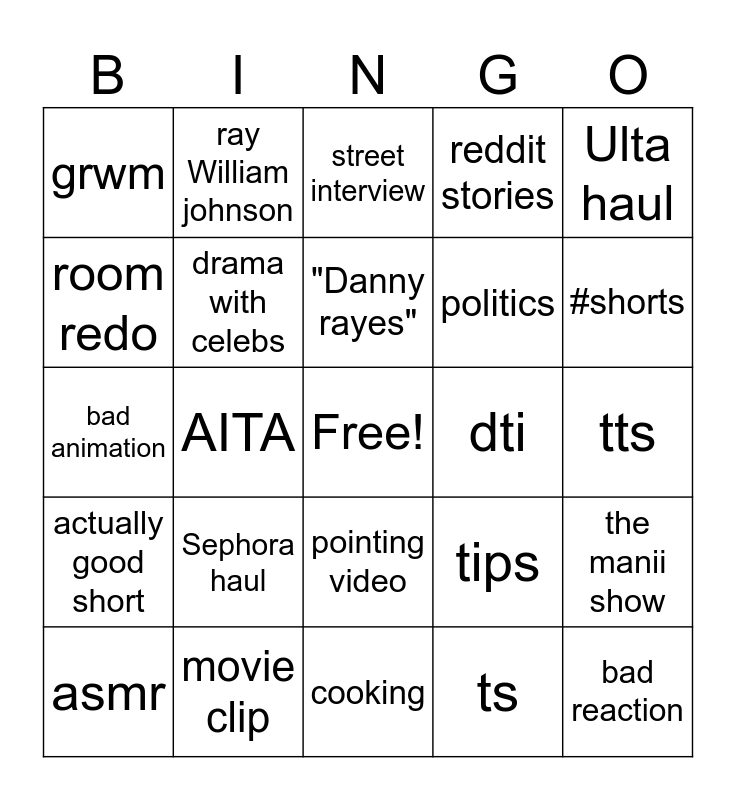 This bingo card has a free space and 24 words: Sephora haul, movie clip, "Danny rayes", asmr, Ulta haul, grwm, room redo, ray William johnson, dti, pointing video, politics, bad animation, tips, the manii show, drama with celebs, ts, tts, street interview, #shorts, AITA, bad reaction, actually good short, reddit stories and cooking.
