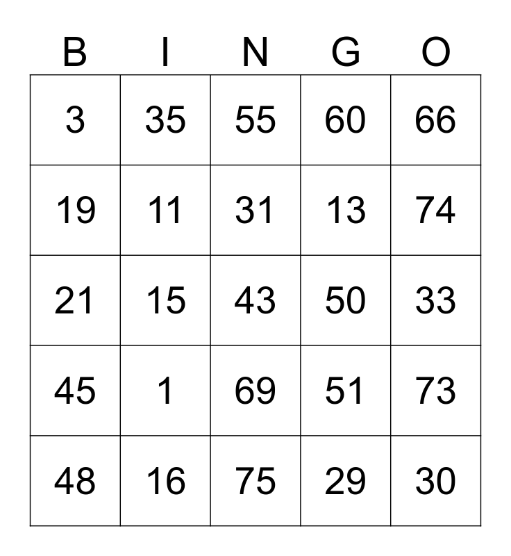 This bingo card has a free space and 24 words: 1, 16, 31, 48, 66, 3, 19, 35, 50, 69, 13, 21, 51, 73, 11, 29, 33, 55, 74, 15, 30, 45, 60 and 75.