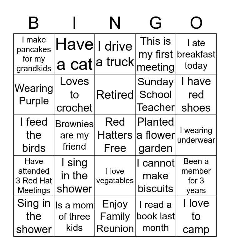 This bingo card has a free space and 24 words: I sing in the shower, Is a mom of three kids, Retired, Sing in the shower, I ate breakfast today, I make pancakes for my grandkids, Wearing Purple, Have a cat, Planted a flower garden, I love vegatables, Sunday School Teacher, I feed the birds, I cannot make biscuits, Been a member for 3 years, Loves to crochet, I read a book last month, I wearing underwear, I drive a truck, I have red shoes, Brownies are my friend, I love to camp, Have attended 3 Red Hat Meetings, This is my first meeting and Enjoy Family Reunion.