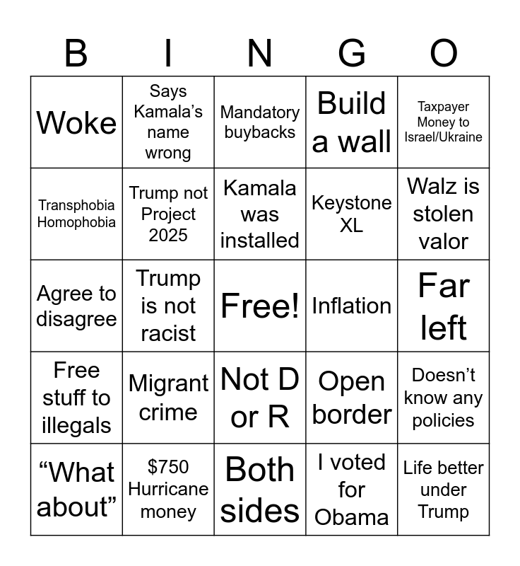This bingo card has a free space and 29 words: “What about”, Interrupts repeatedly, Trump is not racist, J6 not Insurrection, Woke, Mandatory buybacks, Trump not Project 2025, Migrant crime, Inflation, $750 Hurricane money, Far left, Life better under Trump, Both sides, I voted for Obama, Walz is stolen valor, Tampons in boys bathrooms, Not D or R, Free stuff to illegals, Taxpayer Money to Israel/Ukraine, Agree to disagree, Open border, No wars under Trump, Keystone XL, Transphobia Homophobia, Build a wall, Says Kamala’s name wrong, Doesn’t know any policies, Kamala was installed and Religion taught in public schools.
