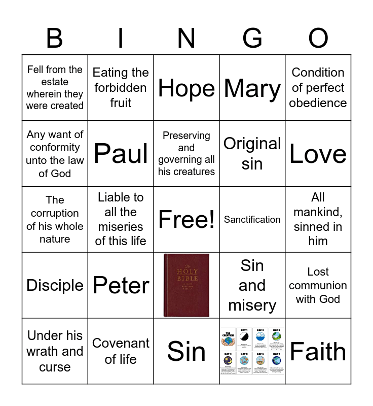 This bingo card has 2 images, a free space and 24 words: Preserving and governing all his creatures, Covenant of life, Condition of perfect obedience, Fell from the estate wherein they were created, Any want of conformity unto the law of God, Eating the forbidden fruit, All mankind, sinned in him, Sin and misery, Original sin, The corruption of his whole nature, Lost communion with God, Under his wrath and curse, Liable to all the miseries of this life, Jesus, Mary, Disciple, Hope, Faith, Love, Sin, Sanctification, Peter, Paul and James.