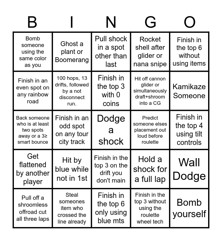 This bingo card has 68 words: Dodge a blue, Dodge a shock, Laptroll someone, Get laptrolled, Get shocked while holding a shock, Track repick, Ghost a plant or Boomerang, Bill off the track, Finish in the top 3 with 0 coins, Finish in the top 3 while reversing across the finish line, Finish in the top 3 on the drift you don't main, Finish in the top 4 on dEA, Finish in the top 4 using tilt controls, Finish in the top 6 without using items, Finish in the top 9 without a MT, Finish in an even spot on any rainbow road, Finish in an odd spot on any tour city track, Bomb someone using the same color as you, Fire yourself twice with the same fire flower item, Hit by blue while not in 1st, Hit off cannon glider or simultaneously draft+shroom into a CG, Hold a shock for a full lap, Get flattened by another player, Bomb yourself, Get redded through triple protection, Get redded in a bottom 4 spot, Bomb someone with a floor bounce or wall bounce, Pull a blooper, Wall Dodge, Combo someone, Pull shock in a spot other than last, Joust Triples, Hit the same exact track hazard twice in one lap, Get 1st, and get last, Rocket shell after glider or nana snipe, Guess who gets the map pick before the roulette starts, Get top 6 when using smart steering the whole race, Pull off a shroomless offroad cut all three laps, Kamikaze Someone, Back someone who is at least two spots away or a 3≥ smart bounce, Complete 70 percent of one lap while holding backcam, Holding 20 coins!, 100 hops, 13 drifts, followed by a not disconnect run., Get at least four seconds of air after halfpipe boost, Take no shortcuts all race., Give someone your crazy eight star, Dont fall off with bowser slick tires motion, Get the same placement two races in a row, Predict someone elses placement out loud before roulette, Steal someones item who crossed the line already, Pull off an automatic drift from wii, Smartbounce yourself, Disconnect lap 3 beginning and have your bot not finish last, Finish in the top 6 only using blue mts, Get 5 kills in one race, Finish in the top 7 while instantly spamming every item you get, Finish in the top 3 without using the roulette wheel tech, Finish top 5 using handheld mode., Pacifist: Get in the top 5 without killing a single person, Surprise kill someone by hiding your weapon in second slot, Grab the same box three times without triggering bagging nerfs, Switch your name to match someone,and finish 1-3 spots above them, Finish with ten coins, but don't touch the finish line last lap, Rawdog a defense in 1, and finish within top 3 that race., Announce every item you get w your placement and get top 5, Hold two new items that were added after MK64 at once, Runner a bagger get within the top 6 and Turn around in first and kill someone at finish line.