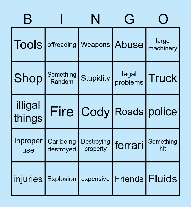 This bingo card has a free space and 24 words: Car being destroyed, Explosion, Stupidity, injuries, large machinery, Tools, Shop, offroading, Roads, Destroying property, legal problems, illigal things, ferrari, Something hit, Something Random, Friends, police, Weapons, Truck, Fire, Fluids, Inproper use, Abuse and expensive.