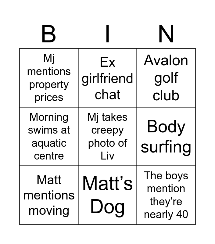 This bingo card has a free space and 8 words: Body surfing, Avalon golf club, Ex girlfriend chat, Matt mentions moving, Mj mentions property prices, The boys mention they’re nearly 40, Morning swims at aquatic centre and Matt’s Dog.