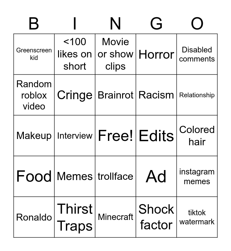 This bingo card has a free space and 24 words: Memes, Thirst Traps, Brainrot, Ronaldo, Disabled comments, Greenscreen kid, Random roblox video, <100 likes on short, Edits, trollface, Racism, Makeup, Ad, instagram memes, Cringe, Shock factor, Colored hair, Movie or show clips, Relationship, Interview, tiktok watermark, Food, Horror and Minecraft.