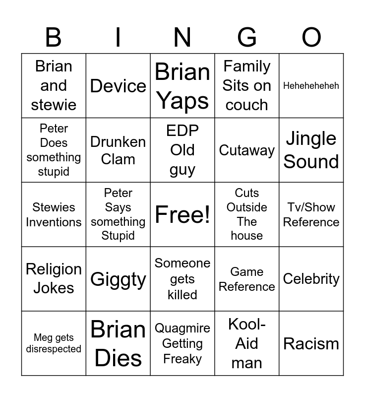 This bingo card has a free space and 24 words: Giggty, Brian Dies, EDP Old guy, Meg gets disrespected, Heheheheheh, Brian and stewie, Peter Does something stupid, Device, Cuts Outside The house, Someone gets killed, Cutaway, Stewies Inventions, Game Reference, Celebrity, Drunken Clam, Kool-Aid man, Tv/Show Reference, Brian Yaps, Jingle Sound, Peter Says something Stupid, Racism, Religion Jokes, Family Sits on couch and Quagmire Getting Freaky.