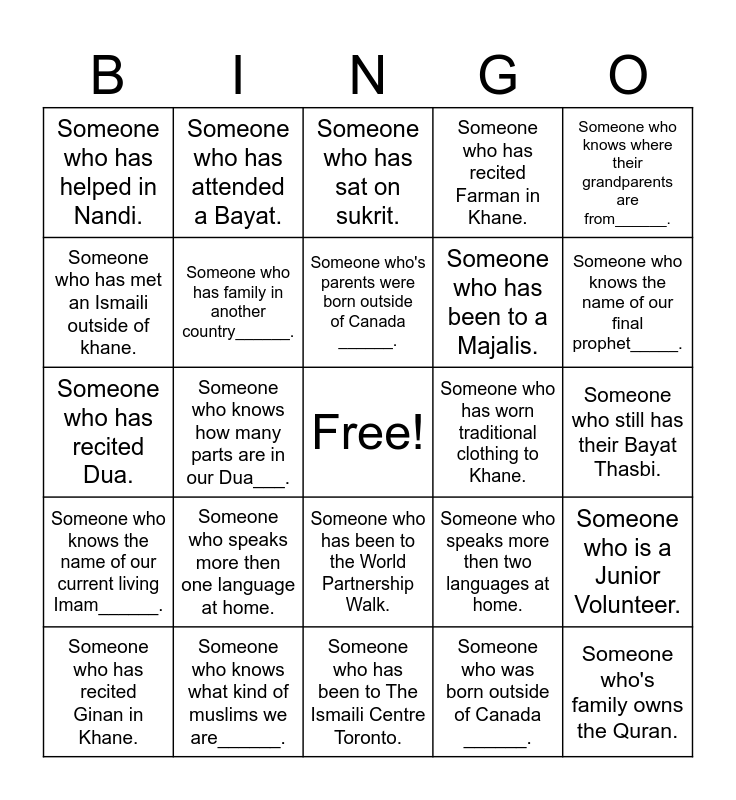 This bingo card has a free space and 24 words: Someone who speaks more then one language at home., Someone who knows what kind of muslims we are______., Someone who's parents were born outside of Canada ______., Someone who has recited Ginan in Khane., Someone who knows where their grandparents are from______., Someone who has helped in Nandi., Someone who has met an Ismaili outside of khane., Someone who has attended a Bayat., Someone who has worn traditional clothing to Khane., Someone who has been to the World Partnership Walk., Someone who has been to a Majalis., Someone who has recited Dua., Someone who speaks more then two languages at home., Someone who is a Junior Volunteer., Someone who has family in another country______., Someone who was born outside of Canada ______., Someone who still has their Bayat Thasbi., Someone who has sat on sukrit., Someone who knows the name of our final prophet_____., Someone who knows how many parts are in our Dua___., Someone who's family owns the Quran., Someone who knows the name of our current living Imam______., Someone who has recited Farman in Khane. and Someone who has been to The Ismaili Centre Toronto..