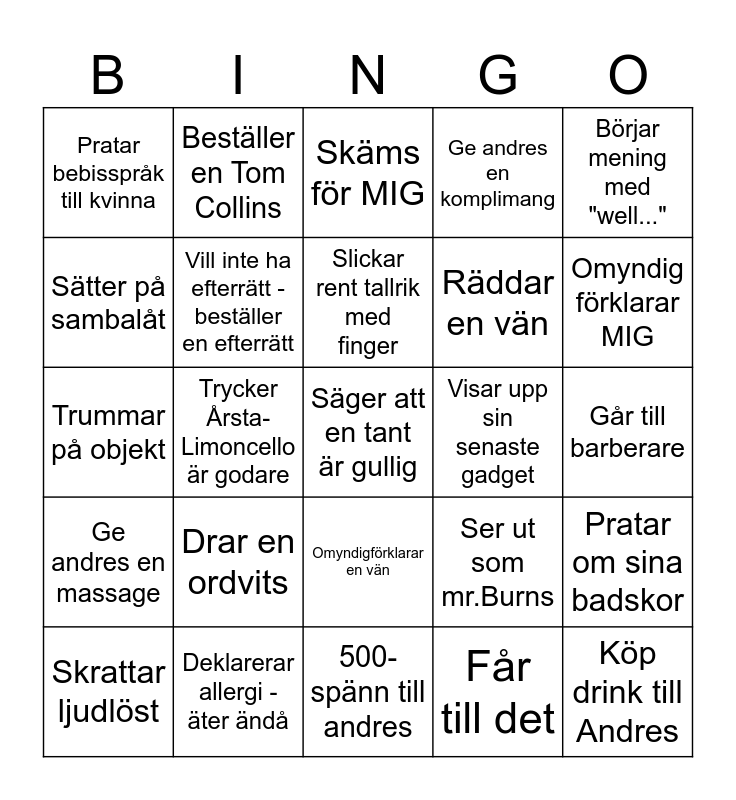 This bingo card has a free space and 24 words: Drar en ordvits, Deklarerar allergi - äter ändå, Slickar rent tallrik med finger, Skrattar ljudlöst, Börjar mening med "well...", Pratar bebisspråk till kvinna, Sätter på sambalåt, Beställer en Tom Collins, Visar upp sin senaste gadget, Omyndigförklarar en vän, Räddar en vän, Trummar på objekt, Ser ut som mr.Burns, Pratar om sina badskor, Vill inte ha efterrätt - beställer en efterrätt, Får till det, Går till barberare, Skäms för MIG, Omyndig förklarar MIG, Trycker Årsta-Limoncello är godare, Köp drink till Andres, Ge andres en massage, Ge andres en komplimang and 500-spänn till andres.