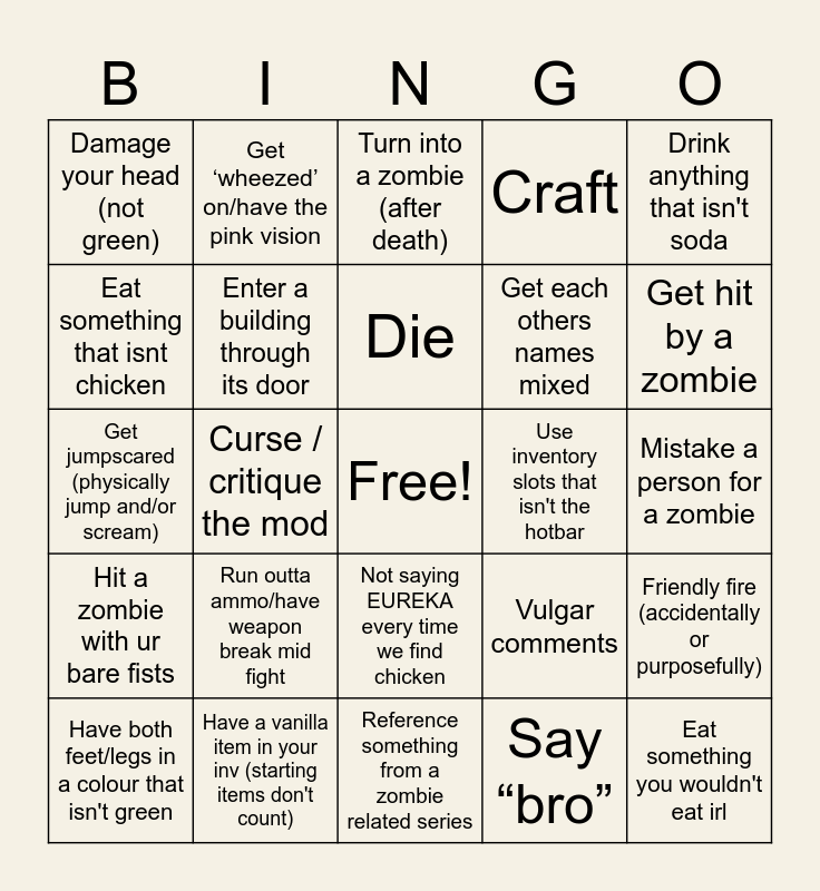 This bingo card has a free space and 34 words: Take fall damage, Say “bro”, Say “zombie”, Walk/run on grass, Hit a zombie with ur bare fists, Enter a building through its door, Drink anything that isn't soda, Have both feet/legs in a colour that isn't green, Get ‘wheezed’ on/have the pink vision, Go outside the city, Die, Turn into a zombie (after death), Quote a meme, Question the mod out loud, Use inventory slots that isn't the hotbar, Get hit by a zombie, Have a vanilla item in your inv (starting items don't count), Get jumpscared (physically jump and/or scream), Run outta ammo/have weapon break mid fight, Vulgar comments, Not saying EUREKA every time we find chicken, Crash a car, Damage your head (not green), Mistake a person for a zombie, Reference something from a zombie related series, Eat something you wouldn't eat irl, Craft, backshots, front shots, side shots, tea bagging, Get each others names mixed, Eat something that isnt chicken, Say 'well well well' when someone eats chicken, Curse / critique the mod, Friendly fire (accidentally or purposefully) and Mention diddy.