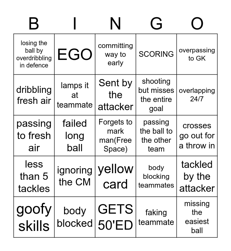 This bingo card has a free space and 24 words: ignoring the CM, body blocked, Sent by the attacker, goofy skills, overpassing to GK, losing the ball by overdribbling in defence, dribbling fresh air, EGO, passing the ball to the other team, yellow card, shooting but misses the entire goal, passing to fresh air, body blocking teammates, tackled by the attacker, lamps it at teammate, faking teammate, crosses go out for a throw in, committing way to early, overlapping 24/7, failed long ball, missing the easiest ball, less than 5 tackles, SCORING and GETS 50'ED.
