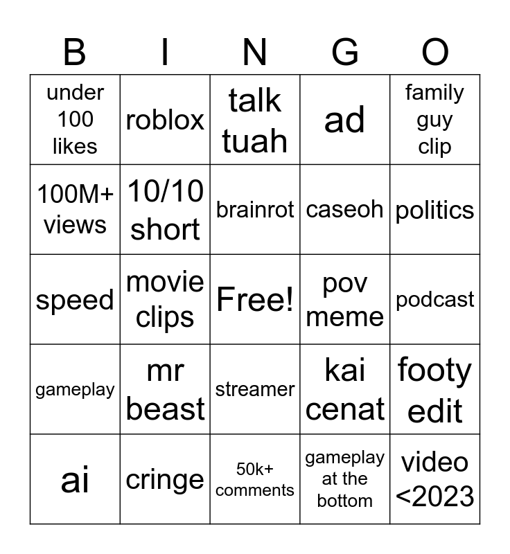 This bingo card has a free space and 24 words: mr beast, cringe, brainrot, ai, family guy clip, under 100 likes, 100M+ views, roblox, pov meme, streamer, caseoh, speed, kai cenat, footy edit, 10/10 short, gameplay at the bottom, podcast, talk tuah, politics, movie clips, video <2023, gameplay, ad and 50k+ comments.