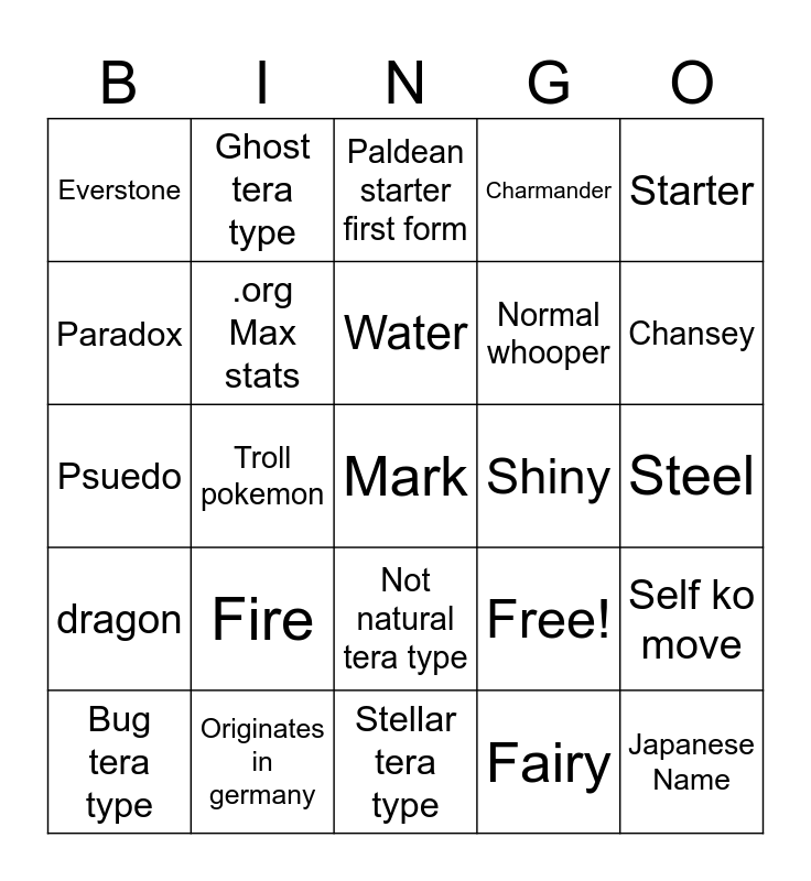 This bingo card has 25 words: Fire, Stellar tera type, Water, Bug tera type, Starter, Everstone, Paradox, Ghost tera type, Shiny, Not natural tera type, Normal whooper, Psuedo, Free!, Self ko move, .org Max stats, Japanese Name, Steel, Paldean starter first form, Chansey, Troll pokemon, Mark, Originates in germany, dragon, Charmander and Fairy.