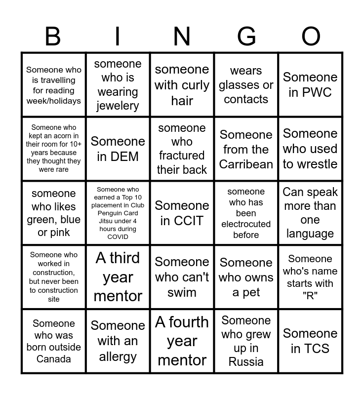 This bingo card has a free space and 24 words: A third year mentor, Someone with an allergy, someone who fractured their back, Someone who was born outside Canada, Someone in PWC, Someone who is travelling for reading week/holidays, Someone who kept an acorn in their room for 10+ years because they thought they were rare, someone who is wearing jewelery, someone who has been electrocuted before, Someone who can't swim, Someone from the Carribean, someone who likes green, blue or pink, Someone who owns a pet, Someone who's name starts with "R", Someone in DEM, Someone who grew up in Russia, Can speak more than one language, someone with curly hair, Someone who used to wrestle, Someone who earned a Top 10 placement in Club Penguin Card Jitsu under 4 hours during COVID, Someone in TCS, Someone who worked in construction, but never been to construction site, wears glasses or contacts and A fourth year mentor.