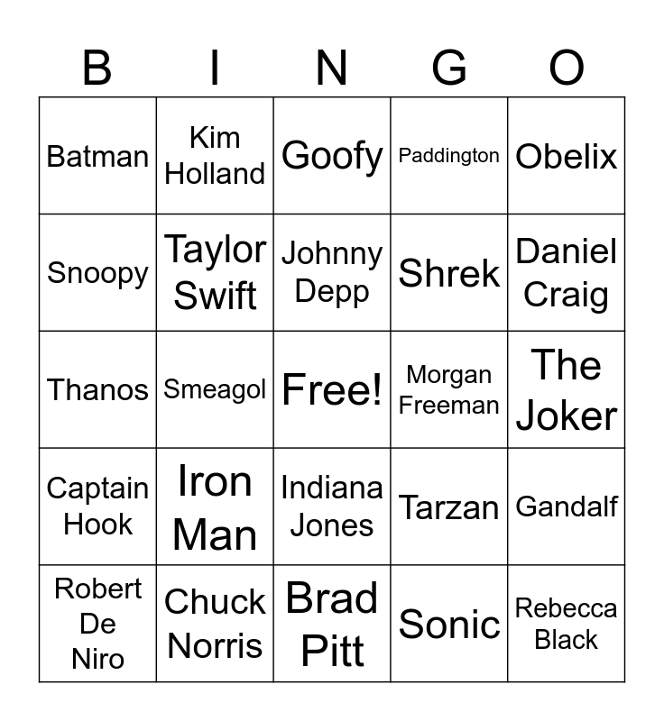 This bingo card has a free space and 80 words: Donald Duck, Mickey Mouse, Goofy, Winnie the Pooh, Eeyore, Alfred Judokus Kwak, Dagobert Duck (Scrooge), Scoobie Doo, Garfield, Lucky Luke, Fred Flintstone, Popeye, Paddington, Batman, Spider-Man, Snoopy, Super Man, Iron Man, Captain America, The Joker, Asterix, Obelix, Thanos, Johnny Depp, Taylor Swift, Justin Bieber, Ariana Grande, Justin Timberlake, Zoë Straub, Britney Spears, Daniel Craig, Eddy Murphy, Brad Pitt, Tom Cruise, Robert De Niro, Morgan Freeman, Angelina Jolie, Jennifer Aniston, Shawn Mendes, Rebecca Black, Nicolas Cage, Hans Zimmer, Emma Watson, Lady Gaga, Jackie Chan, Kim Holland, Joji, Harry Potter, Luke Skywalker, Darth Vader, Gandalf, Smeagol, Tarzan, Peter Pan, Jack Sparrow, James Bond, John Wick, Rambo, Forrest Gump, Indiana Jones, Shrek, WALL-E, Pinocchio, Godzilla, Don Vito Corleone, Simba, Bambi, Rocky, Sherlock Holmes, Voldemort, Captain Hook, Chuck Norris, Geralt of Rivia, Mario, Princess Zelda, Pikachu, Sonic, Donkey Kong, Yoshi and Pac Man.