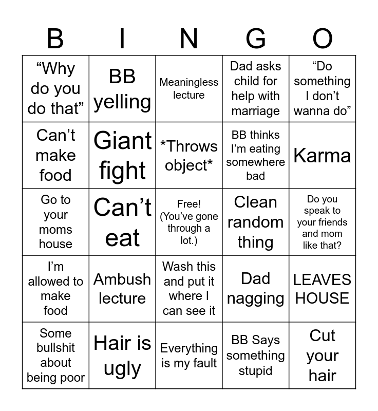 This bingo card has a free space and 49 words: “Hair is too long”, *repeats same thing twice*, *checks camera*, BB Says something stupid, Do you speak to your friends and mom like that?, BB nagging for no reason, BB yelling, BB screeching, BB thinks I’m eating somewhere bad, Can’t wash clothes, Can’t make food, Can’t eat, Dad nagging, Cut your hair, Big big fight!!, “That’s gay”, Meaningless lecture, Clean random thing, BB gives 3 “quests”, “Why do you do that”, Hair is ugly, Everything is my fault, Dad asks child for help with marriage, “Do something I don’t wanna do”, BB gives 10 quests, Ambush lecture, *Throws object*, Crying, LEAVES HOUSE, I’m allowed to make food, “Wash this properly”, Wash this and put it where I can see it, Verbally fighting, Some bullshit about my diet, Some bullshit about being poor, Some bullshit about me being ungrateful, Some irrelevant stuff about my mom, EVIL EYE, Karma, Personal questions, Calling me at the worst time, Really badly timed personal questions, Kicking me out the house, Dad never stands up for me, Go to your moms house, Giant fight, Do you speak to your mom that way?, Do your speak to your friends like that? and Do you speak to your teachers that way?.