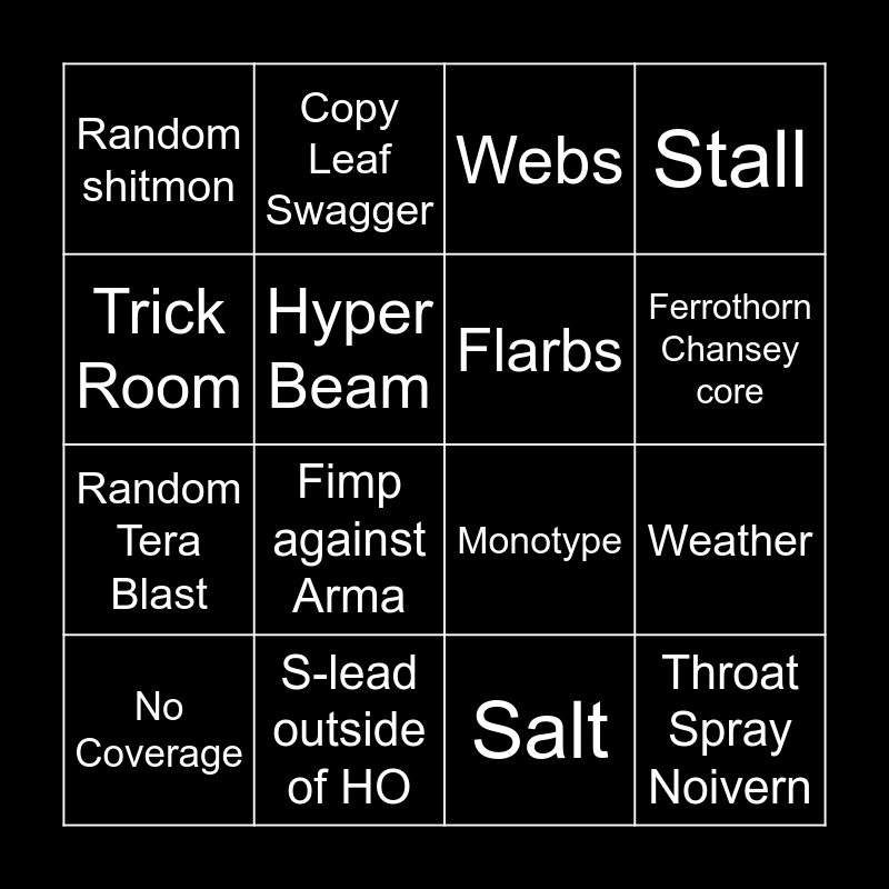 This bingo card has 16 words: S-lead outside of HO, Weather, Webs, Random shitmon, Random Tera Blast, Copy Leaf Swagger, Monotype, Salt, Trick Room, Hyper Beam, No Coverage, Stall, Fimp against Arma, Ferrothorn Chansey core, Flarbs and Throat Spray Noivern.