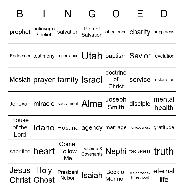 This bingo card has 49 words: forgiveness, Savior, Book of Mormon, miracle, family, mental health, believe(s) / belief, President Nelson, charity, agency, happiness, Plan of Salvation, service, doctrine of Christ, heart, disciple, Redeemer, revelation, truth, obedience, baptism, sacrament, prophet, testimony, Jesus Christ, repentance, restoration, Holy Ghost, Israel, prayer, eternal life, Joseph Smith, sacrifice, Come, Follow Me, Jehovah, marriage, righteousness, gratitude, Mosiah, Hosana, Doctrine & Covenants, House of the Lord, Alma, Isaiah, Utah, salvation, Nephi, Idaho and Melchizedek Priesthood.