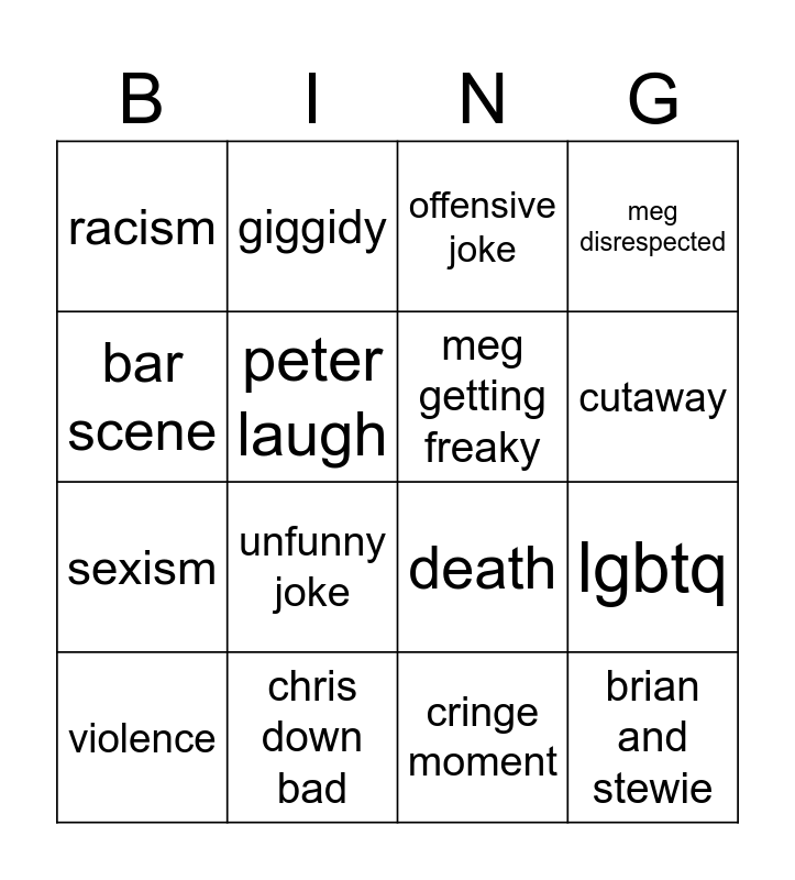 This bingo card has 16 words: chris down bad, lgbtq, offensive joke, racism, sexism, giggidy, death, cringe moment, bar scene, peter laugh, violence, meg disrespected, unfunny joke, cutaway, meg getting freaky and brian and stewie.