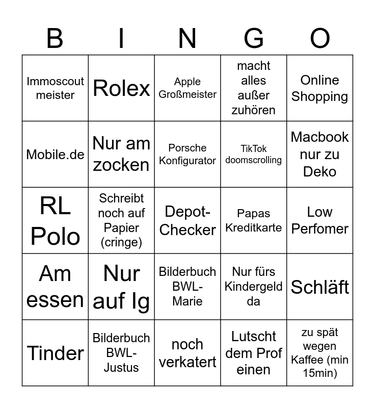 This bingo card has a free space and 24 words: Nur auf Ig, Bilderbuch BWL-Justus, Porsche Konfigurator, Tinder, Online Shopping, Immoscout meister, Mobile.de, Rolex, Papas Kreditkarte, Bilderbuch BWL-Marie, TikTok doomscrolling, RL Polo, Nur fürs Kindergeld da, Schläft, Nur am zocken, Lutscht dem Prof einen, Low Perfomer, Apple Großmeister, Macbook nur zu Deko, Schreibt noch auf Papier (cringe), zu spät wegen Kaffee (min 15min), Am essen, macht alles außer zuhören and noch verkatert.