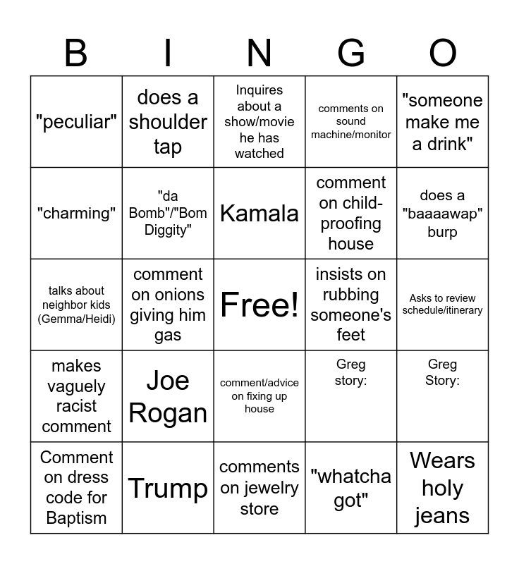 This bingo card has a free space and 24 words: Joe Rogan, Trump, Kamala, Comment on dress code for Baptism, "someone make me a drink", "peculiar", "charming", does a shoulder tap, insists on rubbing someone's feet, comment/advice on fixing up house, comment on child-proofing house, talks about neighbor kids (Gemma/Heidi), Greg story:, Greg Story:, "da Bomb"/"Bom Diggity", "whatcha got", Asks to review schedule/itinerary, Inquires about a show/movie he has watched, does a "baaaawap" burp, comment on onions giving him gas, Wears holy jeans, makes vaguely racist comment, comments on sound machine/monitor and comments on jewelry store.