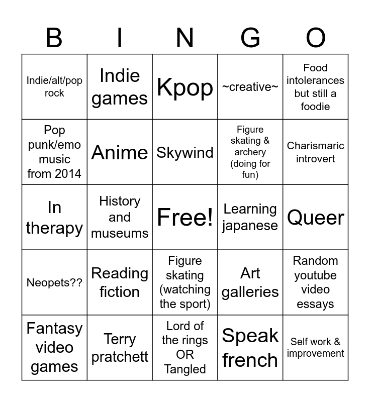 This bingo card has a free space and 24 words: Reading fiction, Terry pratchett, Skywind, Fantasy video games, Food intolerances but still a foodie, Indie/alt/pop rock, Pop punk/emo music from 2014, Indie games, Learning japanese, Figure skating (watching the sport), Figure skating & archery (doing for fun), In therapy, Art galleries, Random youtube video essays, Anime, Speak french, Queer, Kpop, Charismaric introvert, History and museums, Self work & improvement, Neopets??, ~creative~ and Lord of the rings OR Tangled.