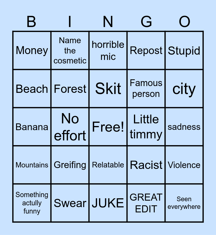 This bingo card has a free space and 24 words: Greifing, Swear, Skit, Something actully funny, Stupid, Money, Beach, Name the cosmetic, Little timmy, Relatable, Famous person, Banana, Racist, Violence, Forest, GREAT EDIT, sadness, horrible mic, city, No effort, Seen everywhere, Mountains, Repost and JUKE.