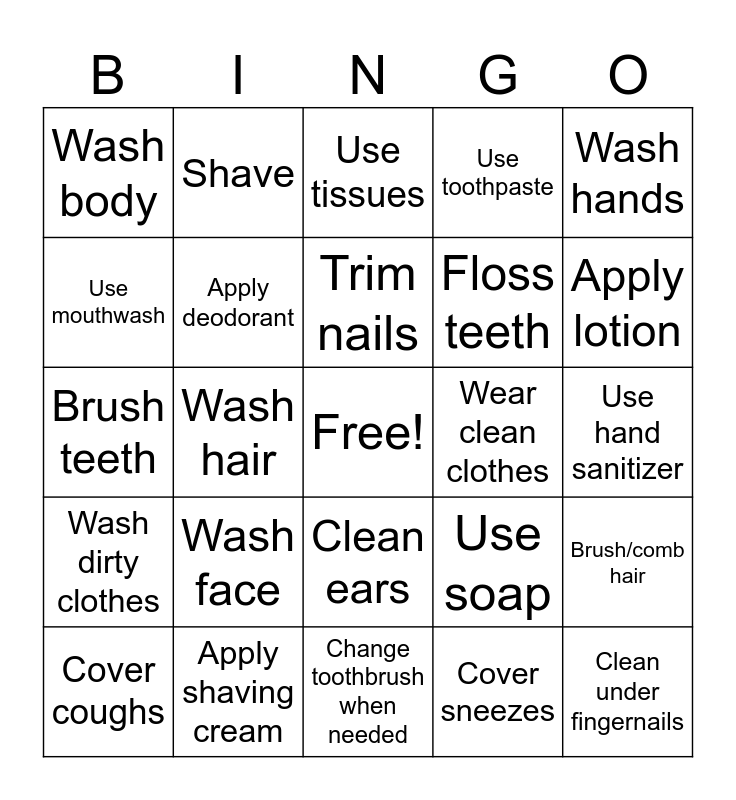 This bingo card has a free space and 24 words: Wash face, Apply shaving cream, Trim nails, Cover coughs, Wash hands, Wash body, Use mouthwash, Shave, Wear clean clothes, Clean ears, Floss teeth, Brush teeth, Use soap, Brush/comb hair, Apply deodorant, Cover sneezes, Use hand sanitizer, Use tissues, Apply lotion, Wash hair, Clean under fingernails, Wash dirty clothes, Use toothpaste and Change toothbrush when needed.