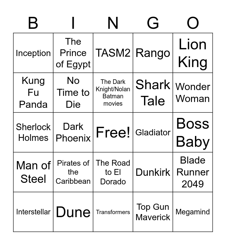 This bingo card has a free space and 24 words: Pirates of the Caribbean, Dune, The Dark Knight/Nolan Batman movies, Interstellar, Lion King, Inception, Kung Fu Panda, The Prince of Egypt, Gladiator, The Road to El Dorado, Shark Tale, Sherlock Holmes, Dunkirk, Blade Runner 2049, No Time to Die, Top Gun Maverick, Boss Baby, TASM2, Wonder Woman, Dark Phoenix, Megamind, Man of Steel, Rango and Transformers.